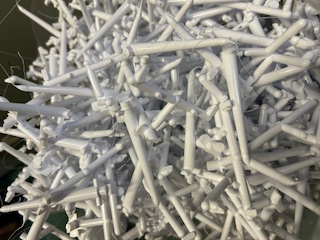 再生プラスチックの利用:製品やスプルー・ランナー・スクラップを工場内の粉砕機で粉砕して、バージン材と混ぜてもう一度、製品を製造するリサイクルを行っています。リサイクルを行うことで、原材料のロスをなくして、材料の循環が生まれます。 右の写真は、アクリル製品と同時に成形されるスプルー・ランナーです。 | |
